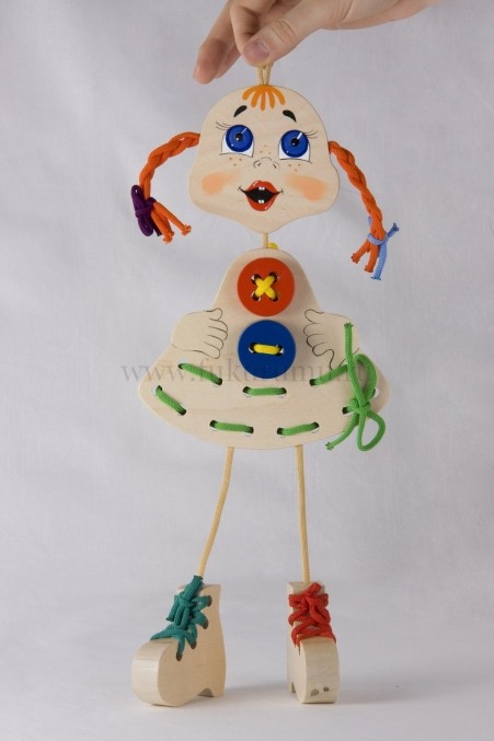 Шнуровка "Пуговичка" интересная игрушка - девчушка, заботясь о которой, ребёнок приобретёт множество необходимых навыков самообслуживания: научится зашнуровывать и завязывать шнурки, заплетать косички, завязывать бантики, делать стежки и иметь представление о том, как пришиваются пуговицы. Причём учиться всему этому малыш будет без принуждения в игре, ведь каждое утро его подружку Пуговичку нужно собрать на улицу или в детский сад. Прошнуровывая украшения на её платье, ребёнок тренирует мелкую моторику пальчиков, развивает хороший вкус. Также, после игры шнуровка может служить прекрасной деталью интерьера комнаты.