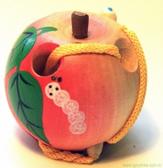 "Яблоко шнуровка малое лак расписное" представляет собой наливное деревянное яблоко с отверстиями. Через отверстия в яблоке протянут шнурок, к которому крепится деревянная фигурка червячка. Покажите малышу, как ловкий червячок "ныряет" в дырочку и тянет за собой шнурок – при этом "вынырнуть" он должен либо из соседнего отверстия, либо из того, которое расположено наискосок. Обязательно хвалите ребенка за успехи – ведь маленьким ручкам нужно приспособиться к такой работе.