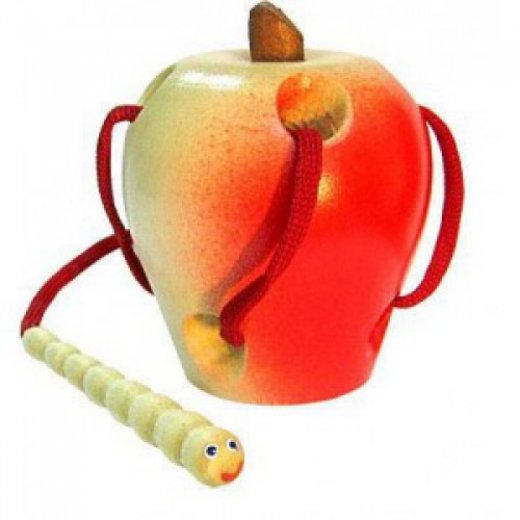 Шнуровка "Яблоко" представляет собой наливное деревянное яблоко с 8 отверстиями. От него отходит матерчатый шнурок с обаятельным червячком. Игрушка, окрашенная вручную, очень похожа на настоящий фрукт, его удобно держать в руках, что очень важно для малыша. Покажите малышу, как ловкий червячок "ныряет" в дырочку и тянет за собой шнурок – при этом "вынырнуть" он должен либо из соседнего отверстия, либо из того, которое расположено наискосок. Обязательно хвалите ребенка за успехи – ведь маленьким ручкам нужно приспособиться к такой работе.