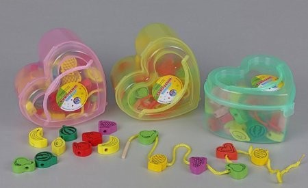Шнуровка в банке 60 дет. " Фрукты" - это набор мелких деталей разной формы и цвета, уложенный в пластиковый чемоданчик в форме сердца. В комплект также входят два длинных шнурка с деревянными наконечниками, облегчающими процесс вдевания.