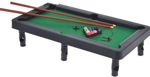 Состав: 1 стол, 2 машинки, 1 треугольник, 11 цветных шаров, 2 кия для бильярда.