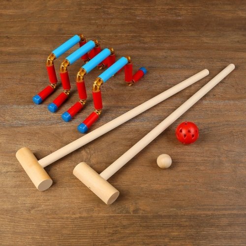 Необходимо установить ворота, задача игроков по очереди провести мячик через все ворота с помощью ударов молотка. Играть в детский крокет можно как на улице, так и дома. Игра хоть и подвижная, но безопасная для окон и техники.