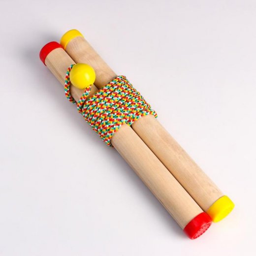 На концах веревочки привязаны 2 деревянных ручки-палочки, на середине веревочки закреплен деревянный шарик.