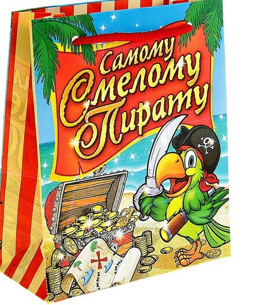 Подарочный пакет Смелому пирату - можно использовать как небольшой презент или как красивую упаковку под непосредственный подарок. Выполнен он в ярких и насыщенных тонах, с изображением знаменитого попугая капитана флинта, одноногого пирата, грозы морей. Такой пакет непременно понравится ребенку.