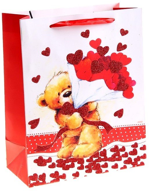 Купить Пакет Мишка с букетом из сердец 26х32 в Новосибирске Вы можете в магазине развивающих и настольных игр "Игры Почемучек"