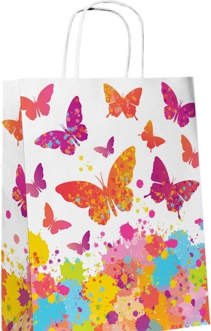Пакет из беленой крафт-бумаги «Бабочки» — отличная упаковка для презента! Ручки у пакета крученые, выполнены из крафт-бумаги, что делает упаковку стильной и в то же время довольно прочной. Благодаря качественной печати рисунок не сотрётся и не выгорит и к тому же он достаточно прочен, способен выдержать до 10 килограмм. Так что в дальнейшем его владелец может пользоваться им по прямому назначению, для походов в магазин и т.д.