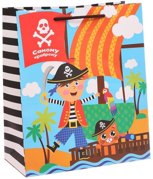 Пакет подарочный Самому храброму – несомненно понравится всем мальчишкам и юным озорникам. Его можно использовать как небольшой презент или как красивую упаковку под непосредственный подарок. Ламинированные бумажные пакеты — лидеры по популярности среди подарочной упаковки. Выполнен он в ярких и красочных тонах, с изображением юного пирата на корабле.