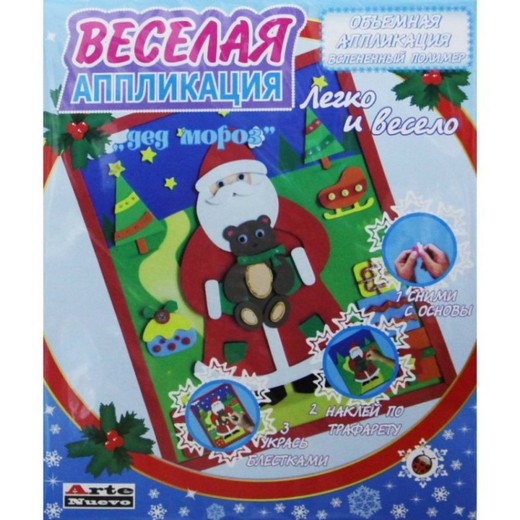 Веселая аппликация "Дед Мороз" представляет собой аппликацию без клея. Вам нужно отклеить готовые заготовки и приклеить (как наклейку, без клея), на основу картины. Сами наклейки разных размеров - есть и крупные детали, а есть и совсем маленькие, а это отличная работа для маленьких пальчиков. В набор входит все, что нужно для работы, ничего дополнительно покупать или подготавливать для занятий не надо. Занятие увлекательное, и, конечно, это очень хороший подарок для бабушек-дедушек, сделанный руками ребенка. Работа получается яркая, объемная.