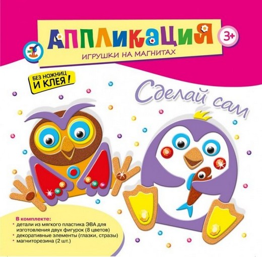 Сделанная своими руками поделка - отличный подарок для родных и друзей! Вместе с ребёнком внимательно рассмотрите картинку-образец. Выберите, какую из двух фигурок будете собирать. Возьмите самую большую деталь - основание фигурки (из более толстого пластика без подложки и клеевого слоя). Приклейте на неё цветные детали ,из пластика на клеевой основе. Обращайте внимание на последовательность наклеивания: какая деталь должна оказаться снизу, а какая - сверху. Приклейте глазки и украсьте фигурку стразами. Приклейте кусочек магнита с обратной стороны фигурки по центру. Делать ребенок может как один, так и вместе с вами.