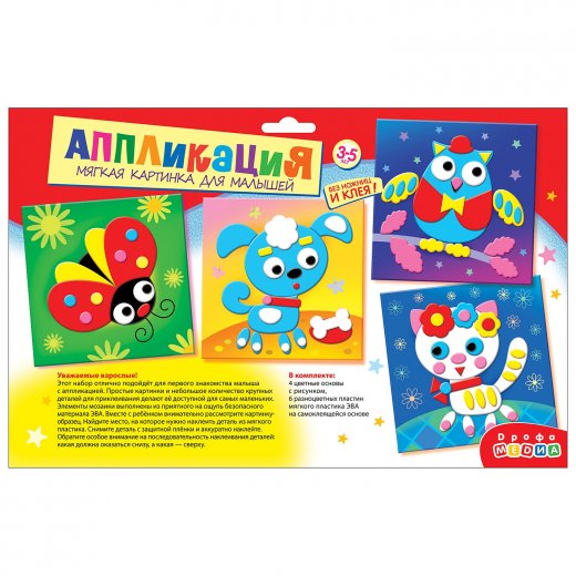 В наборе вы найдёте всё, что нужно для создания забавной мягкой картинки: вам не понадобятся дополнительные материалы, клей или ножницы. Чтобы наклеить деталь, нужно просто снять с липкого слоя защитную плёнку и приложить деталь в нужное место картинки. Яркие, простые иллюстрации прекрасно подходят для первого знакомства малыша с аппликацией. В наборе 4 картинки-основы для аппликации с изображениями милого котёнка, забавного щенка, элегантного филина и весёлой божьей коровки. Набор для творчества будет особенно интересен девочкам.