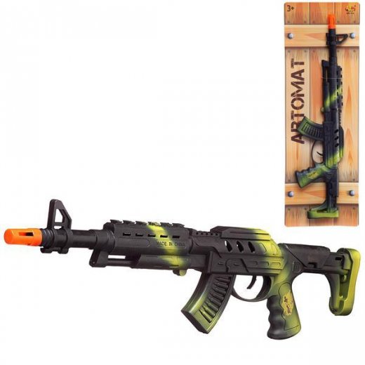 Играть с оружием - любимая забава для многих мальчишек. Этот автомат выполнен в камуфляжной расцветке. Если постоянно нажимать на курок, то будет слышан трест, имитирующий стрельбу и внутри ствола ружья будут появляться искорки.