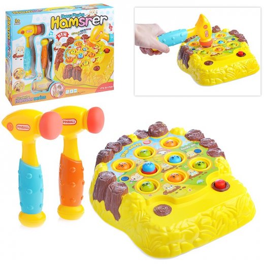 Стучалка "Поймай крота" представляет собой игровую платформу, на которой находится 8 лунок. В лунках спрятались мордочки ярких кротиков. В процессе игры, нужно ударять молоточком по высовывающимся мячикам.