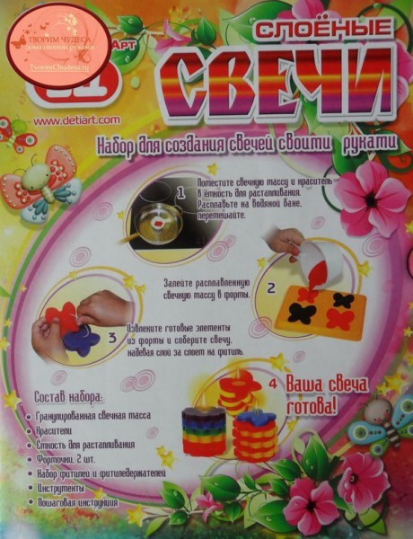 Слоеные свечи "Бабочки-цветочки". Замечательный творческий набор позволит создать своими руками красивейшие слоеные свечи. В процессе создания свечей дети получат множество полезных сведений о секретах превращения жидкости в твердое тело, о суспензиях и пигментах, узнают много нового и интересного о свойствах химических веществ. Яркие свечи из нескольких слоев в форме бабочек и цветов станут прекрасным подарком лучшей подруге или маме с бабушкой.