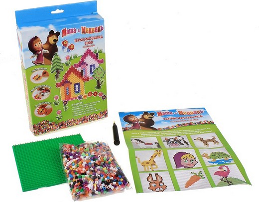 Собрав картинку из деталей на игровом поле, требуется накрыть ее термобумагой и прогладить утюгом. Под действием горячего утюга детали сплавляются между собой. Через несколько минут, когда мозаика остынет, бумагу аккуратно отклеиваем, и получаем готовую твердую картинку.Термомозаика "Маша и Медведь" станет самым интересным занятием для Вашего малыша. Наборы из этой серии дают массу возможностей для творчества. Здесь можно не просто копировать изображение с образца, а заменять одни цвета другими или вовсе придумать свой сюжет. В процессе сборки термомозаики развиваются математические способности, мелкая моторика, внимание, память, воспитываются такие качества как усидчивость и упорство в достижении цели. А мозаики по мотивам русских народных сказок помогут малышу запомнить его любимые сказки и научиться их пересказывать, при этом разовьется речь малыша и навыки грамотного изложения.