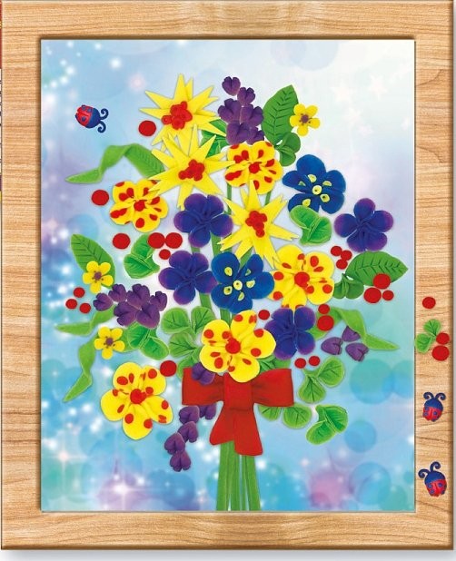 Состав набора: 5 цветов теста для лепки, стек, клей ПВА, карточка, рамка, инструкция.