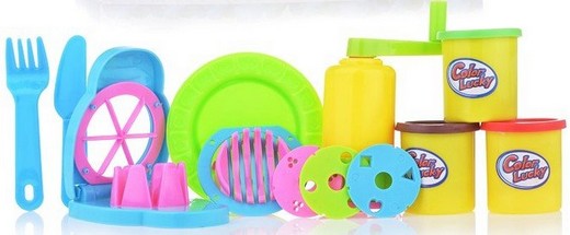 Состав набора: масса для лепки(3 цвета), пресс, тарелка, нож, вилка.