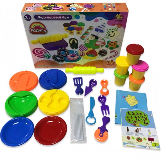Комплектация: 5 баночек цветного мягкого пластилина, 4 формы для создания леденцов, скалка фигурная, нож для пиццы, 2 тарелки, нож, 1 комплект кухонных приборов (4 предмета), 1 комплект палочек, салфетка-скатерть для творчества.