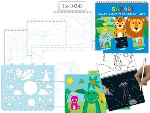 Альбом д/творчества САФАРИ с трафаретами, раскрасками, гравюрами TUKZAR (ТУКЗАР) – это красивый и интересный альбом для юных любителей животных. С помощью данного альбома ребенок сможет без особых трудностей создавать образы и даже целые композиции животных и мест их обитания. Играя, он будет ознакамливаться с видами животных и сред их обитания. Этот альбом поможет вашему ребенку не только провести свой досуг в игре, но и получить из этого максимум пользы. Данное занятие способствует развитию фантазии, образного и творческого мышления, а также мелкой моторике рук.
