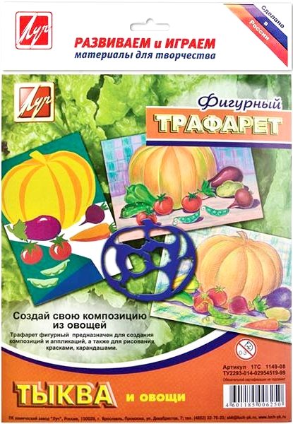 Трафарет "Тыква и овощи" идеально подойдет для изготовления открыток, аппликаций, приглашений и других оригинальных изделий. Трафарет можно использовать для рисования отдельных плодов и композиций из них. Фигурный трафарет в форме тыквы имеет внутри контуры для рисования множества распространенных овощей. С помощью трафарета ребенок научится рисовать аппетитные композиции и выучит названия разных овощей. Можно изобразить натюрморты по примерам на упаковке или придумать нечто совершенно новое, развивая фантазию и творческий вкус!