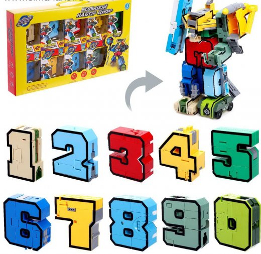 Набор роботов трансформеров "Робо-цифры 0-9"- это уникальные трансформеры: цифры, превращающиеся в машинки, танки или самолеты. Вы сможете собрать из них одного большого несокрушимого Трансбота , который может стать и любимой игрушкой Вашего ребёнка, и учебным материалом для изучения арифметики.