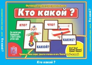 Обучающая игра-лото Кто какой? – это весьма интересная и занимательная обучающая игра-лото для дошкольников, которая поможет развить речевые навыки, научиться подбирать слова, которые отвечают на вопросы и подготовиться к обучению грамматике. перед началом игры разрежьте большие карты по пунктирным линиям. У вас получится 12 карточек с вопросами и 84 карточки с картинками. Играть могут от 2 до 6 детей. Ведущий раздает карточки с вопросами так, чтобы синих и красных карточек у каждого участника было поровну. Эти карточки раскладываются попарно красная с синей. Затем ведущий показывает поочередно карточки с картинками. Дети называют их и определяют кому подходит картинка. Например слово»ножницы» отвечает на вопрос что? какие?, а слово»улитка» - кто? какая? К каждой паре вопросов нужно подобрать 14 картинок. Выигрывает тот, кто подберет свои картинки правильно и быстрее других.