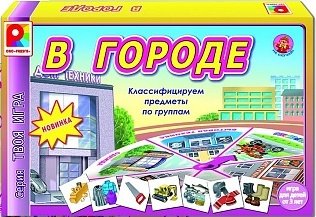 Настольная игра Твоя игра В городе из серии «Твоя игра» предлагает детям прогуляться по городу, и понять - в какие магазины нужно пойти, чтобы приобрести одежду, продукты питания, инструменты и другие вещи. Эта развивающая многовариантная, предназначена для детей дошкольного возраста. Она научит детей классифицировать предметы по группам, таким как, транспорт, инструменты, бытовая техника, одежда, продукты, и играть по правилам в группе детей.