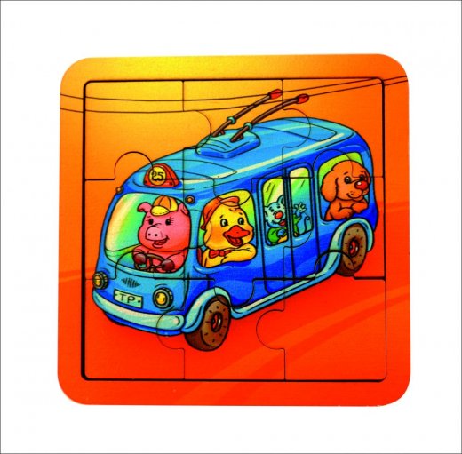 Пазл "Троллейбус" - включает в себя рамку и девять крупных деталей с фрагментами небольшой картинки. Сложив элементы пазла в правильном порядке в рамку, ребенок сможет полюбоваться изображением яркого троллейбуса, который перевозит животных.