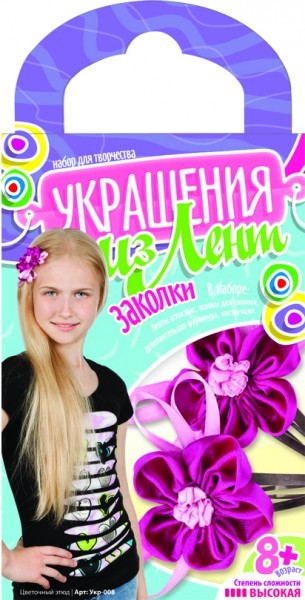 Состав набора: атласные ленты, основы для заколок, дополнительная фурнитура, инструкция. Рекомендуемый возраст: от 8-ми лет.
