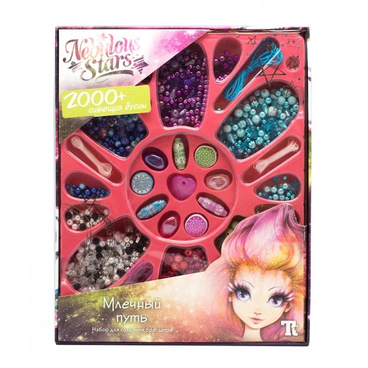 Если ваша дочка любит создавать украшения своими руками, то этот набор не останется без ее внимания, так как предлагает рукодельнице стать автором красивого браслета из сияющих бусинок. Этот набор посвящен девочкам-звездочкам Nebulous Stars, поэтому рукодельницы смогут создать такие же красивые браслетики, как и любимые героини. Для этого малышки могут воспользоваться множеством сияющих бусинок из комплекта, которые останется лишь нанизать в понравившемся порядке на ниточку, и браслет готов. А декоративные подвески разной формы с изящными узорами позволят девочкам сделать украшение еще более стильными и модными.