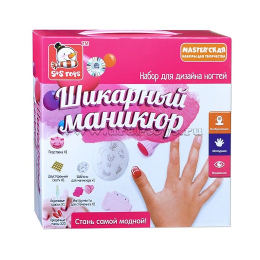 Безусловно, каждая девочка мечтает быть самой модной и красивой. С помощью набора для дизайна ногтей Шикарный маникюр каждая девочка может легко превратиться в настоящую леди. В наборе есть все необходимое для изысканного маникюра. Экспериментируй, создавай свой неповторимый дизайн ногтей. Игра с набором будет способствовать развитию мелкой моторики, воображения, аккуратности.