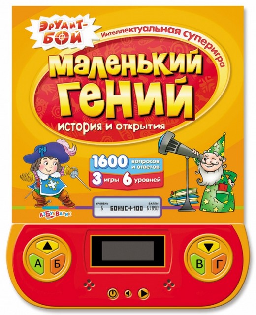Книга-викторина «Маленький гений История и открытия» это невероятный девайс, радующий, как детей, так и родителей. Она представляет собой суперсовременный игровой модуль (миниприставку) с помощью которого можно играть в прилагающийся к нему игры. Данный вид книги-викторины освещает совершенно тему истории и великих открытий. Именно такой направленности будут вопросы игры. Кроме того, игрок может сохранять игровой процесс в любое время.