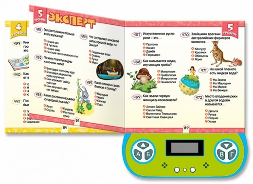 Включите игровой джойстик. Выберете в книге и на электронном устройстве задания которые хотите пройти. Читайте вопросы в книжке и отмечайте варианты ответа на джойстике.