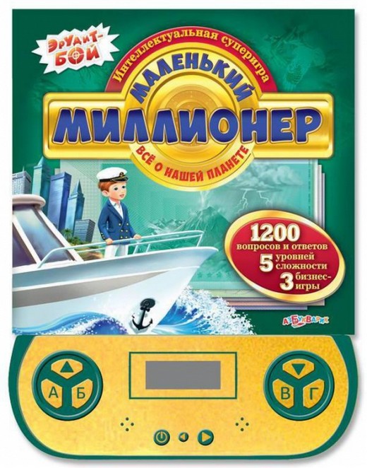 Книга-викторина «Маленький миллионер Все о нашей планете» это невероятный девайс, радующий как детей, так и родителей. Она представляет собой суперсовременный игровой модуль (миниприставку) с помощью которого можно играть в прилагающийся к нему игры. Данный вид книги-викторины освещает тему «Все о нашей планете». Именно такой направленности будут вопросы игры. Кроме того, игрок может сохранять игровой процесс в любое время.