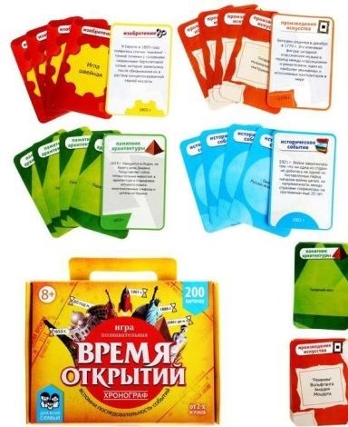 Что появилось раньше: чайный пакетик или шариковая ручка, камертон или саксофон? Разобраться в этих и других вопросах поможет игра "Время событий", в которой Вам предстоит определить время изобретения предмета или вспомнить дату какого-либо исторического события. За ограниченное время сделать это не так-то легко, зато очень интересно и безумно увлекательно. Перед Вами четыре категории вопросов: памятники архитектуры, исторические события, произведения искусства, изобретения. На рубашке каждой карточки написано название изобретения, события, произведения искусства или памятника архитектуры, а с обратной стороны год основания/создания и небольшая историческая ссылка. Вам предстоит Выложить правильную хронологическую последовательность из карточек за минимальное время. Садимся в круг, ходим по очереди и не забываем каждый ход засекать время.