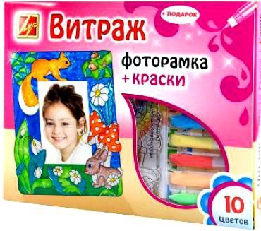 Состав набора: витраж-фоторамка из прозрачного пластика (для фото 9,5х13 см), настольный держатель, витражные краски 10 цветов (из них 3 перламутровые и 3 с блестками), подарочная коробка с инструкцией. Размер: 25см на 20см. Рекомендуемый возраст: от 5-ти лет.