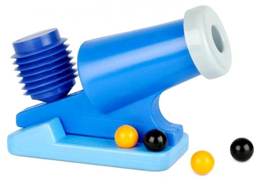 Эта забавная игрушечная пушка, сделанная из пластика и раскрашенная в пестрые цвета, имеет механический принцип работы. В отверстие ствола вкатывается круглый снаряд, после чего необходимо с силой ударить по маленькому воздушному поршню с другой стороны, чтобы поток воздуха с силой вытолкнул шарик. Выстрелами из пушки можно сбивать солдатиков и небольшие постройки из конструктора, таким образом она прекрасно впишется в любую игру с боевыми сценами.