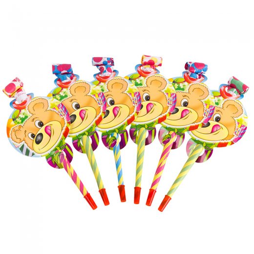 Игрушка-свистулька при использовании разворачивает длинную часть из бумаги, издавая характерный громкий звук. Игрушка дополнена круглой карточкой с изображением симпатичного медвежонка.