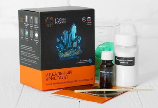 Набор для экспериментов "Идеальный кристалл синий" позволит юному ученому наблюдать ускоренный процесс формирования твердых предметов, который в природе бы занял целые тысячелетия. В комплект входит все необходимое, чтобы вырастить красивый кристалл прямо у себя дома. Оригинальное изделие можно использовать в качестве сувенира, подарка или украшения интерьера комнаты.