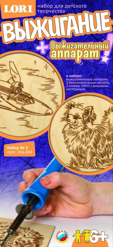 Данный набор для творчества создан специально для начинающих. В комплекте есть подробная инструкция, используя которую выжечь изображения на картинках-основах сможет даже ребенок с шести лет. А главное, заботливый производитель включил в набор сам выжигательный аппарат и даже специальные дополнительные насадки. Работает он от сети, поэтому вам не придется покупать дополнительные элементы питания. Получившиеся изображения станут украшением детской или послужат отличным подарком.