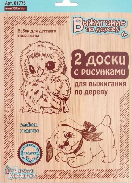 Выжигание по дереву 2 доски с рисунками по дереву Совенок и щенок – обязательно понравится ребенку в качестве подарка. Такое увлекательное занятие надолго займет юного мастера, а сам процесс работы и ее результат подарят ребенку массу положительных эмоций и восторга.