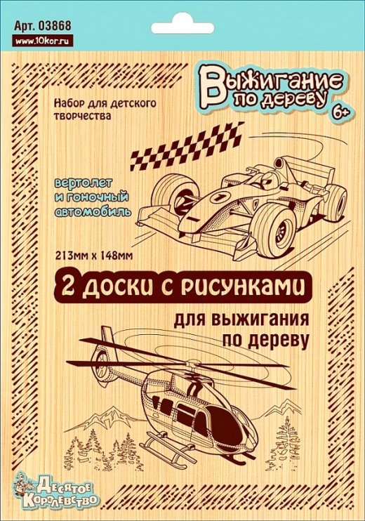 Доски для выжигания Вертолет и Гоночный автомобиль – обязательно понравится ребенку в качестве подарка. Такое увлекательное занятие надолго займет юного мастера, а сам процесс работы и ее результат подарят ребенку массу положительных эмоций и восторга.
