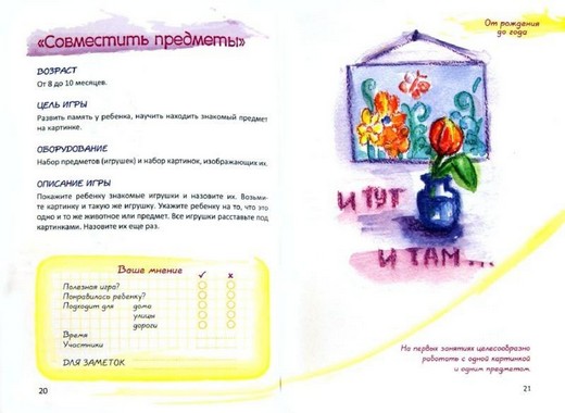 С первых дней жизни малыш познает богатство и многообразие окружающего мира, строит свои первые взаимоотношения со взрослыми. Хорошо, когда общение с малышом основано на игре, это позволит без труда и усилий раскрыть в ребенке новые возможности, таланты, интересы. Вы сможете улучшить память, мышление, внимание ребенка, приучить к дисциплине, подготовить к общению со взрослыми и сверстниками. Совместные игры помогут родителям сблизиться с малышом и укрепить взаимные доверие и любовь. Все успехи и достижения вашего малыша вы можете записывать в удобную интерактивную таблицу, это сделает использование книги не только полезным, но и удобным.