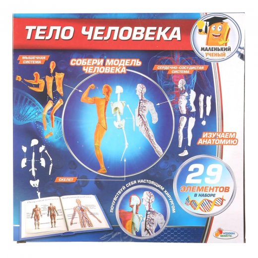 Анатомический набор Играем вместе «Маленький учёный: Тело человека» позволит изучить и поближе познакомиться со строением тела человека. Он состоит из 29 деталей, с помощью которых удастся собрать модель человека, в которую помимо его скелета также будут входить мышцы и сердечнососудистая система. Готовая модель сможет устойчиво стоять на ровной горизонтальной поверхности, благодаря специальной подставке. Модель человека выглядит очень реалистично. Все элементы набора имеют качественное исполнение и безопасны в использовании.