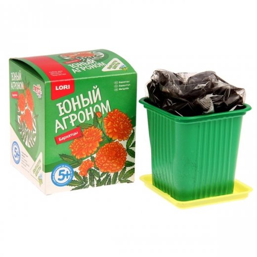 Юный агроном Бархатцы – это набор для посадки и выращивания цветов в домашних условиях. В комплекте уже есть все необходимое. В набор входит горшок, пакет земли уже готовой к посадке, семена, простая инструкция. С помощью такого набора Ваш ребенок сможет сам посадить цветочек и понаблюдать за его ростом. А сколько эмоций принесет распустившийся цветочек.