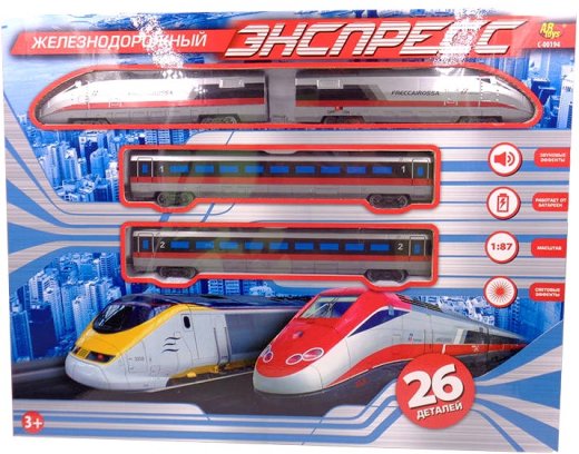 Железная дорога "Экспресс" представляет собой игрушку со световыми и звуковыми эффектами. Из 26 деталей ребенку предстоит построить железную дорогу в масштабе 1:87, а затем пустить по ней скоростной поезд с вагонами. Игрушечный локомотив будет ездить по рельсам совсем как настоящий поезд, так как выполнен он с высокой степенью детализации.
