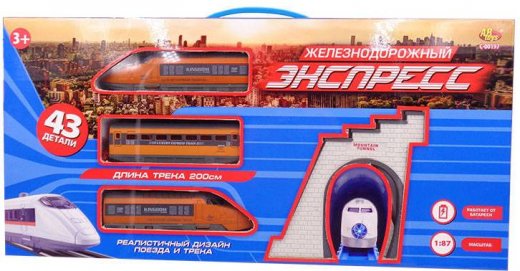 Железная дорога "Экспресс", состоит из множества предметов, позволяющих ребенку собрать железнодорожный состав, полотно с горным тоннелем и окружающим ландшафтом. Ребенку понравится управлять скоростным поездом, наблюдая за тем, как он уверенно проходит по железнодорожному пути. Длина дороги составляет 2 метра. Железнодорожный состав выполнен в масштабе 1:87.
