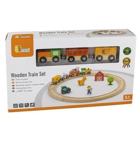 Набор железная дорога "Ферма Viga" порадует вашего ребенка и подарит много часов удовольствия. Этот красочный деревянный набор содержит поезд из 4 элементов, фигурки 2 животных, фигурку фермера, домик, трактор. Животных можно размещать отдельно, создавая сценки из жизни на ферме, либо перевозить на поезде.