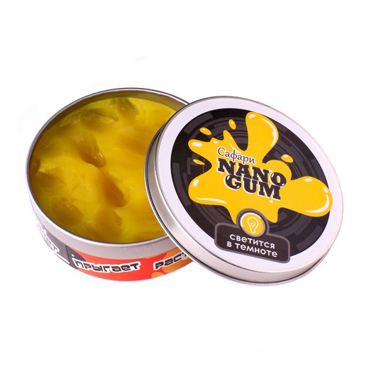 "Жвачка для рук NanoGum сафари" - это уникальная развивающая игрушка из особого полимерного вещества. Главное и самое поразительное качество Наногама – сочетание свойств жидкости и твердого тела! Положите игрушку на твердую поверхность и уже через пару минут на месте упругого мячика вы увидите растекшуюся лужицу. Но стоит только помять это пластилинообразное вещество, как скатанный шарик будет отскакивать от пола или превращаться в ваших руках в разнообразные фигурки. Чем сильнее нажим, тем тверже становится пластичная масса.
