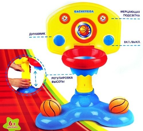 В этот веселый музыкальный баскетбол рекомендуют играть малышам от 9 до 19 месяцев. Настройка уровня высоты поможет подобрать именно такие параметры, которые будут подходить Вашему крохе. Имеется также кнопка включения-отключения звука, что дает возможность играть тихо или с музыкой. Кнопка возле кольца отвечает за включение музыкального сопровождения. Когда Ваш карапуз будет попадать в кольцо, то зазвучат одобряющие слова и включиться мигающая подсветка.