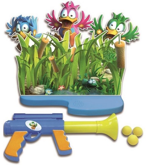 Утки обожают играть в прятки, показываясь из зарослей, и снова ныряя вниз. С этой игрой можно попробовать себя в роли охотника, при этом ни одна утка не пострадает. В комплекте идет яркое удобное ружье с двумя рукоятками, которое заряжается шарами со стороны дула. На подставке с электронным основанием изображены утки, которые появляются из травы и каштанов. Нужно лишь прицелиться и выстрелить. Если попасть в утку, она крякнет и опрокинется. Можно устраивать целые соревнования по стрельбе и меткости.